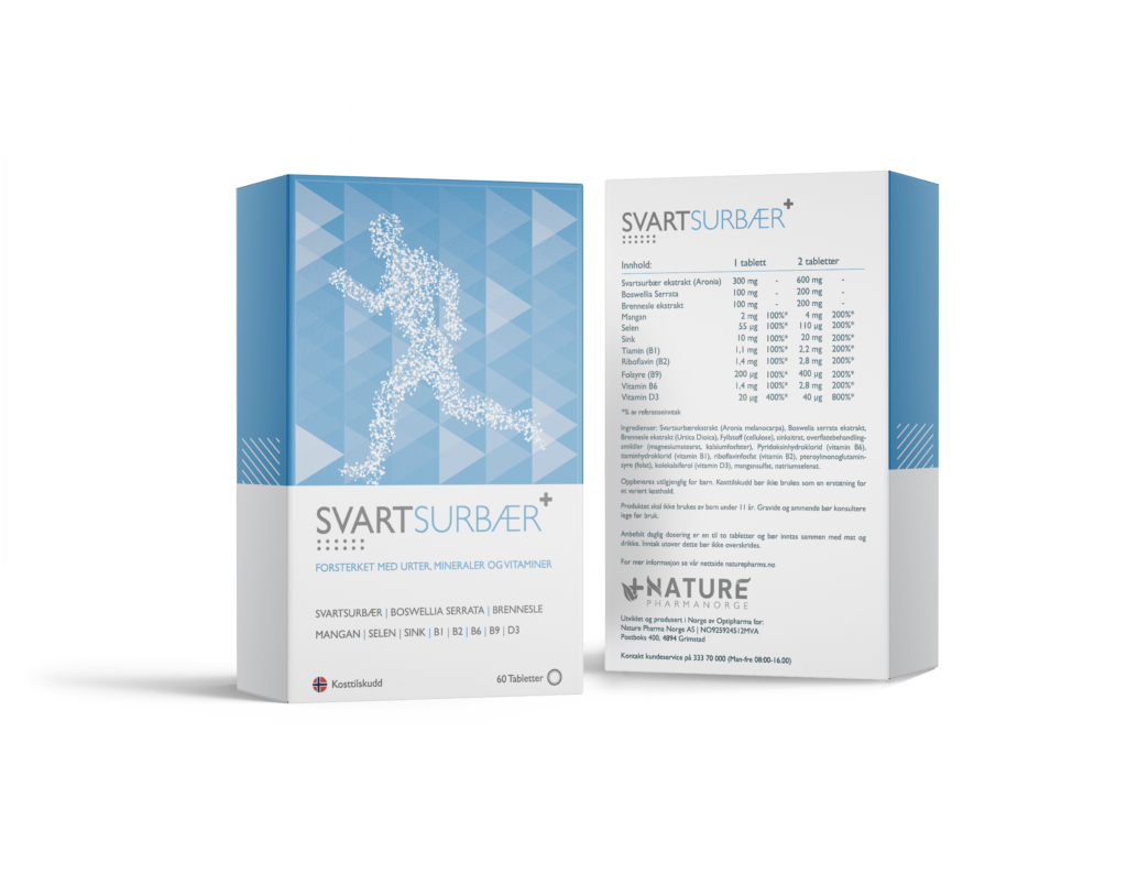 Med den unike kombinasjonen av Svartsurbær, Boswellia serrata, Brennesle, Mangan, Selen, Sink, Vitamin B1, B2, B6, B9 og D3, jobber Svartsurbær+ i harmoni for å gi deg positive helsefordeler. Ingrediensene har dokumentert effekt på ulike områder og bidrar til å opprettholde et sterkt immunsystem, sunne muskler og ledd, god hjertehelse, skarp hjernefunksjon, sunne blodkar, balanserte hormoner, samt en energisk og vital kropp.